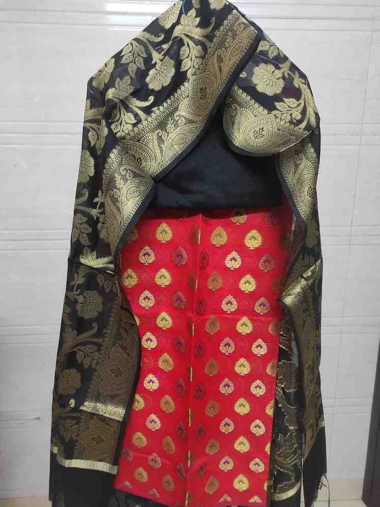 Black and red colour banarsi silk suit with heavy golden zari and meenakari work. A must have piece in your wardrobe for that festive or wedding look.