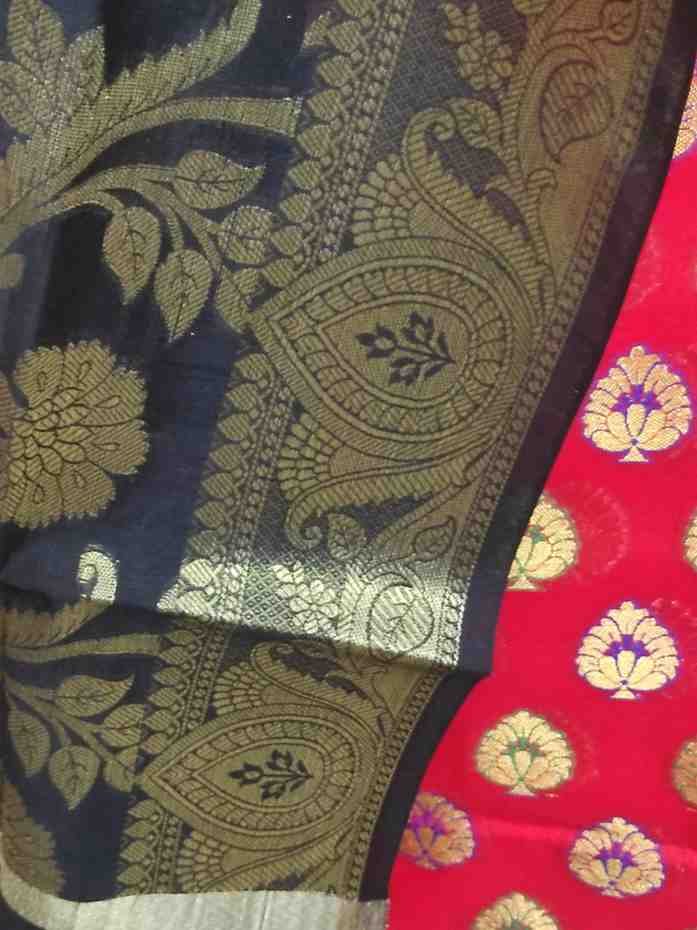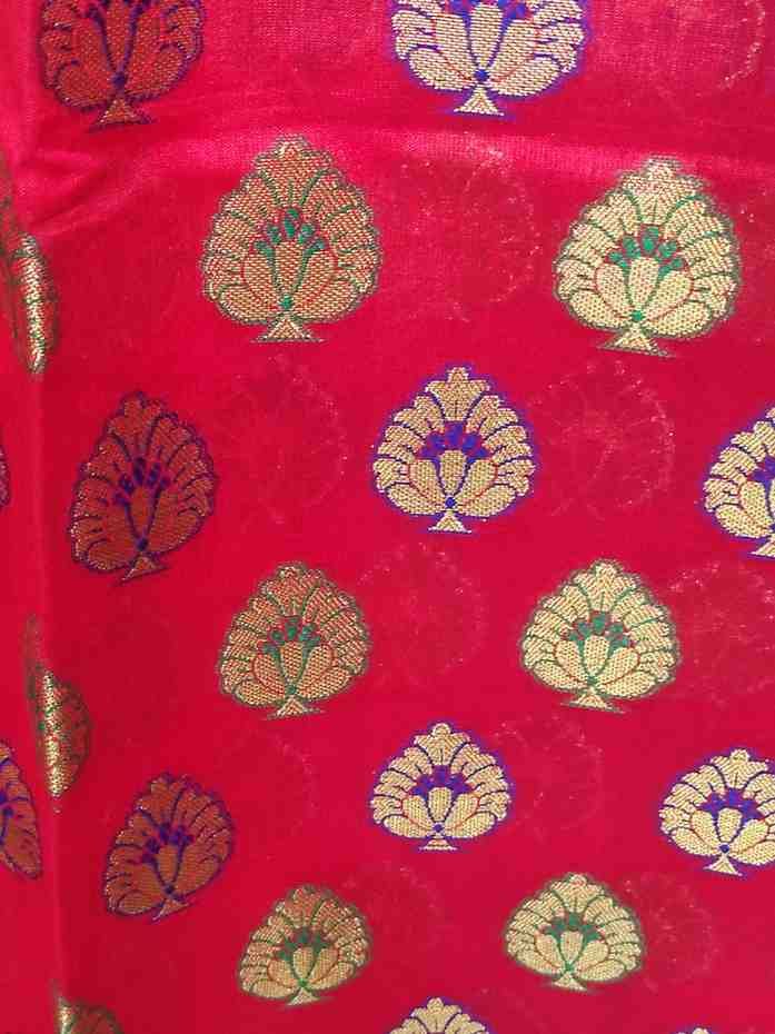 Top: 2.5 metres red colour banarsi silk cloth with very heavy zari and meenakari work.