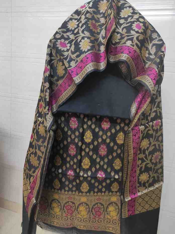 Dupatta: 2.5 metres black colour banarsi silk dupatta with all over zari woven zaal and meenakari work pattern and tassels at the ends.Dry clean only for maintainence.