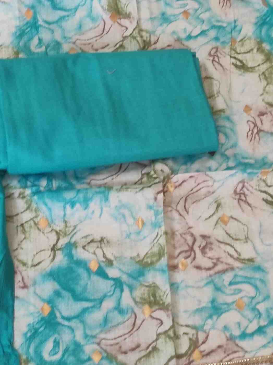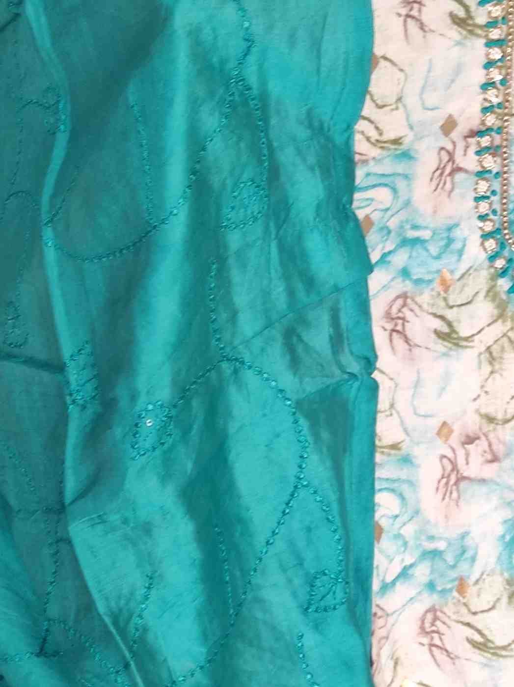Bluish green colour pure cotton printed and embrioded suit with sequin,and thread work perfect for Festive and special occasions. Top material is blue and white colour pure cotton printed with hand embroidery and sequin work on the tie patti. Dupatta is blue colour semi silk with thread work.Bottom is plain blue colour pure soft cotton material.Dimensions: