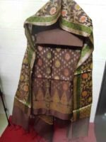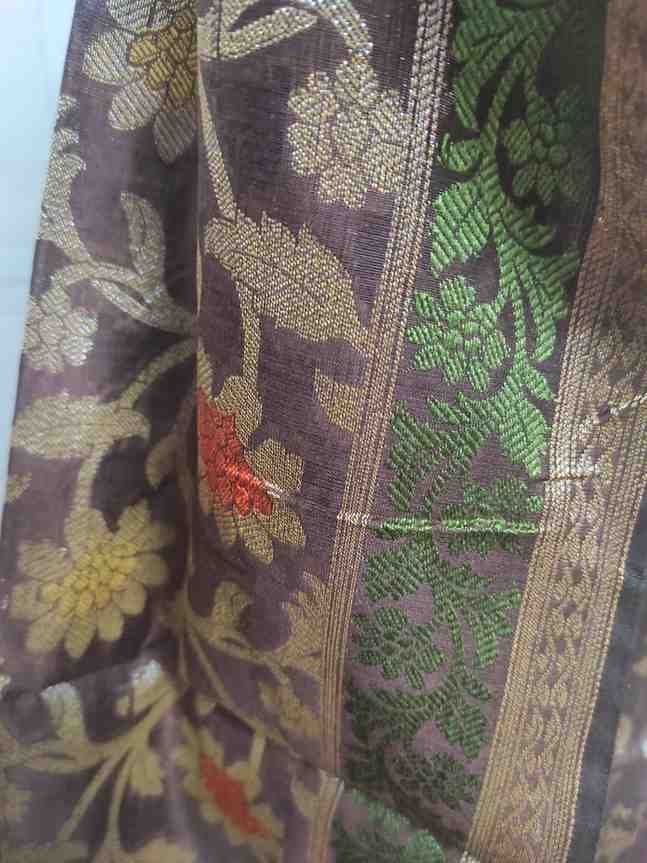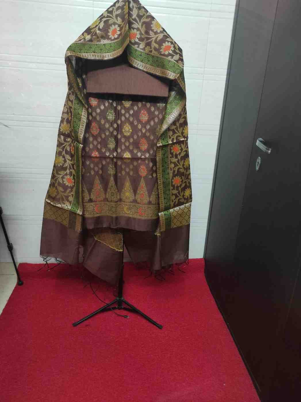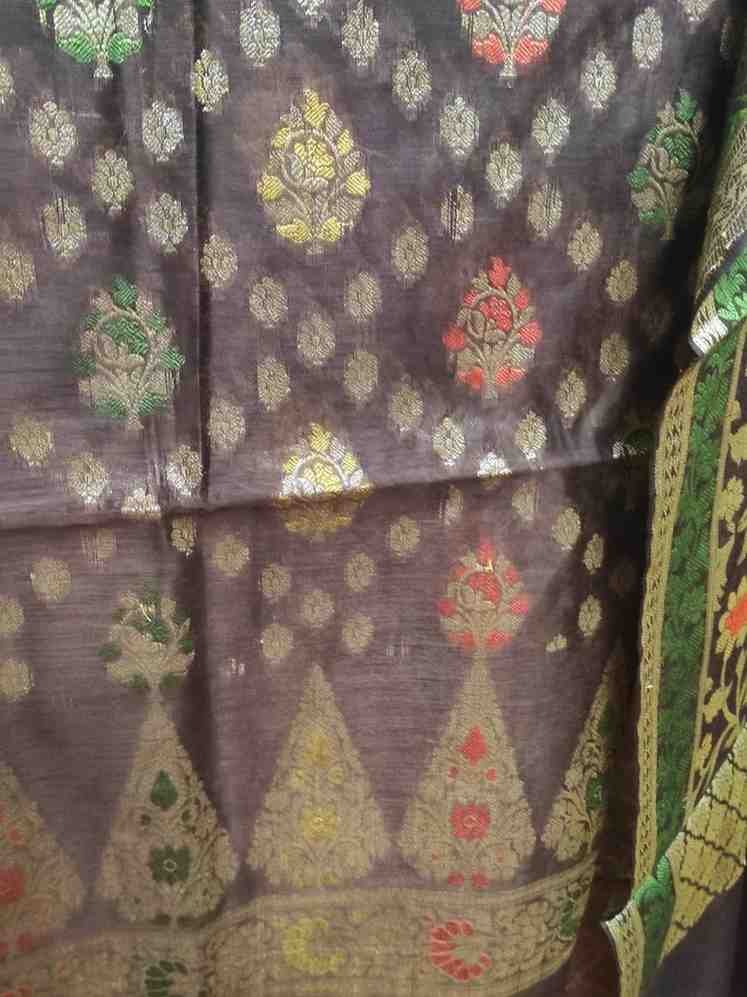 Dupatta: 2.5 metres brown colour banarsi silk dupatta with all over zari woven zaal and meenakari work pattern and tassels at the ends.Dry clean only for maintainence.