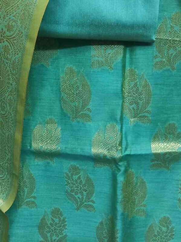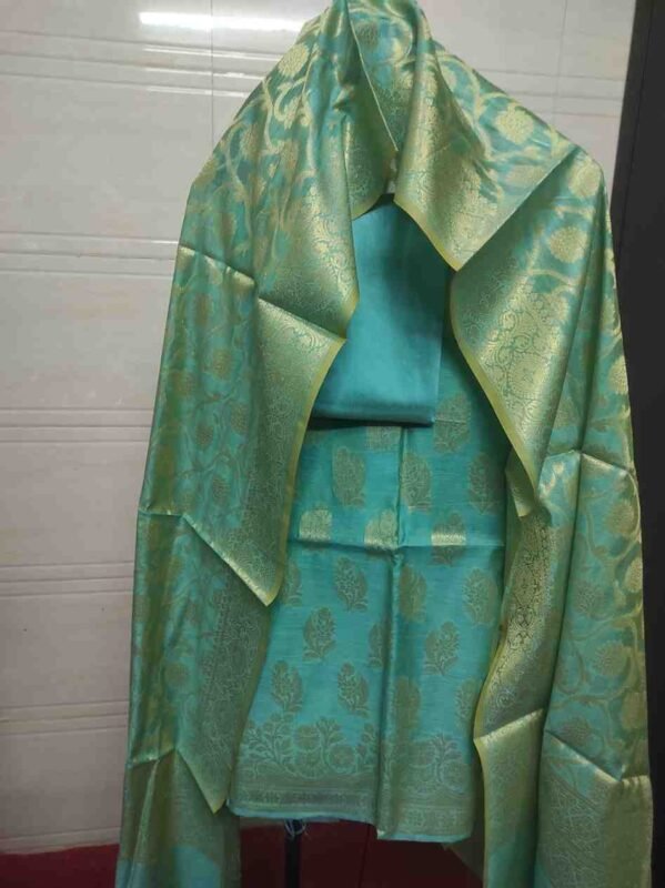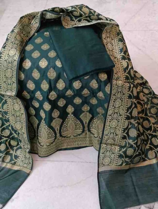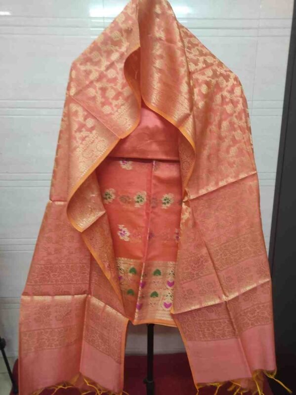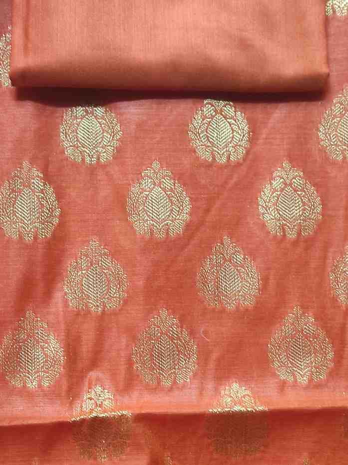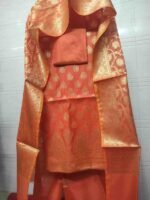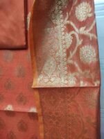 Dark orange colour banarsi silk suit with heavy golden zari work . A must have piece in your wardrobe for that festive and wedding wear looks.