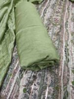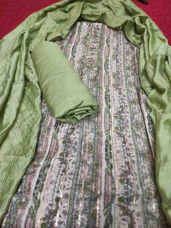 Green and beige colour pure cotton Jaipuri print suit for Festive and special occasion wear, top material is very soft beige colour semi silk printed material embellished with sequins and hand embroidery work. Bottom is green colour plain rayon silk. Dupatta is green colour semi silk with thread and sequin embroidery work.Dimensions: