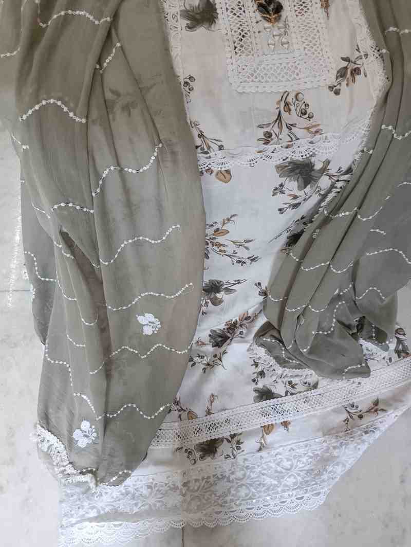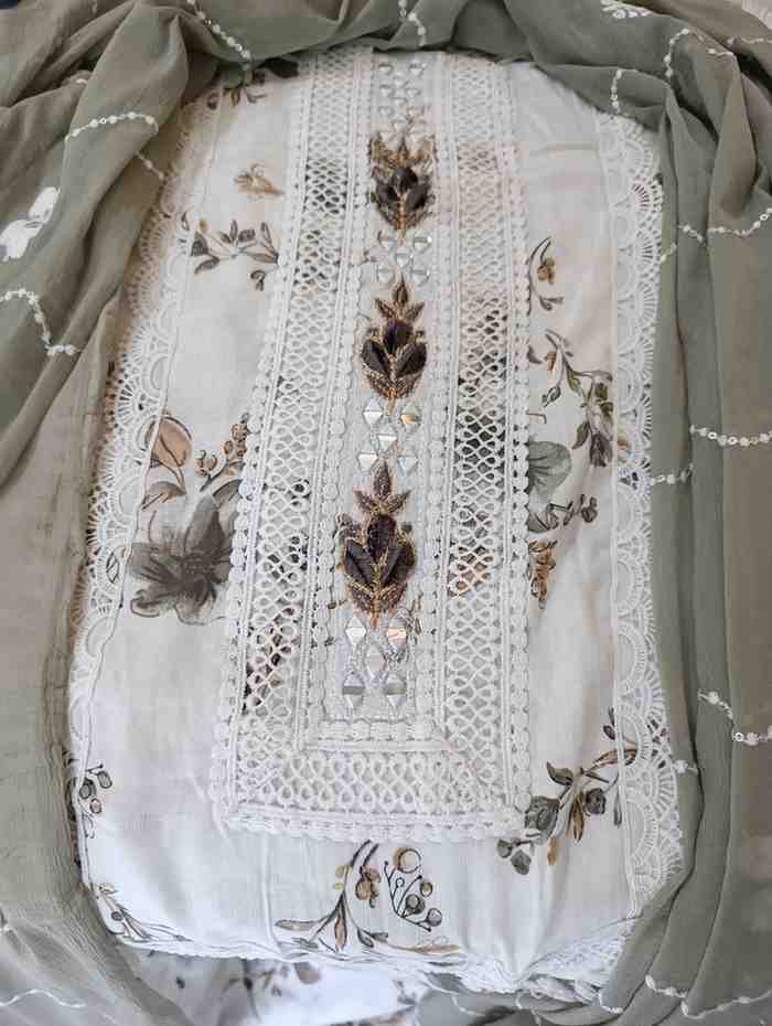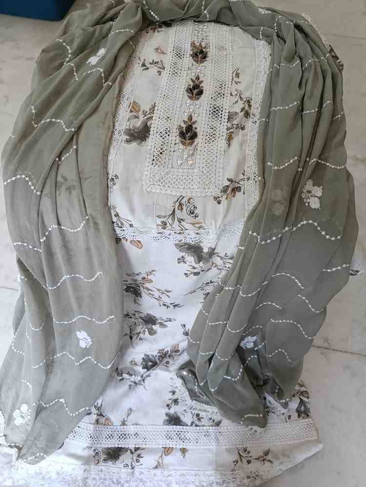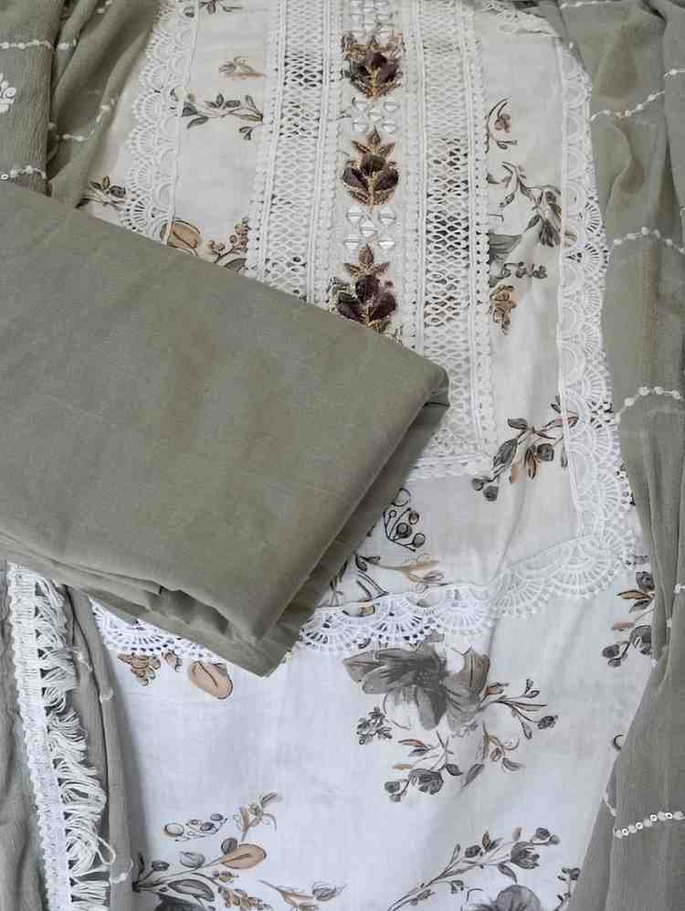 Pure cambric cotton embrioded suit with mirror, lace and thread work on tie patti, perfect for festive and special occasions. Top material is grey colour cotton embellished with embroidery,thread work and lace work on the tie patti and bottom. Dupatta is grey colour plain crape chiffon with thread and lace work.Dimensions: