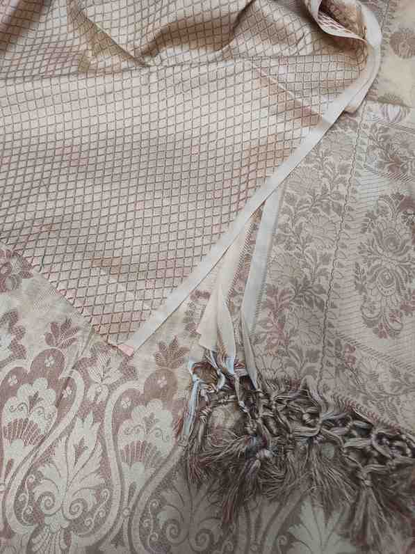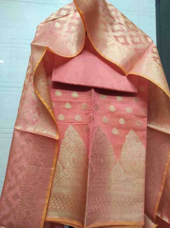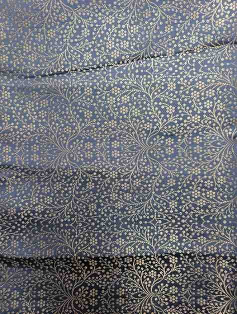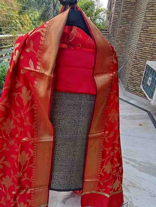 “Grey colour satin silk banarsi suit with heavy golden zari work . A must have piece in your wardrobe for that festive and wedding wear looks.
