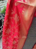 Dupatta: 2.5 metres red colour banarsi dupatta with all over zari woven zaal work pattern and tassels at the ends.