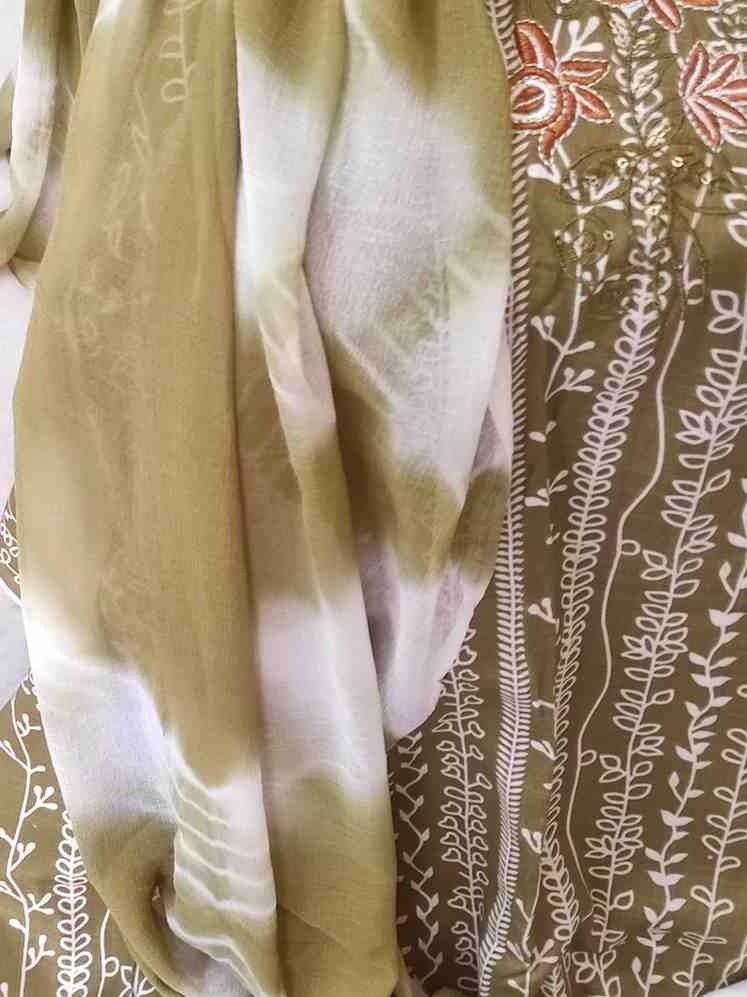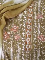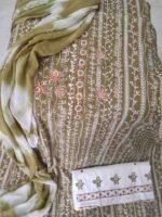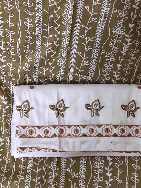 It is printed pure cotton embroided suit in military green colour with a dupatta.