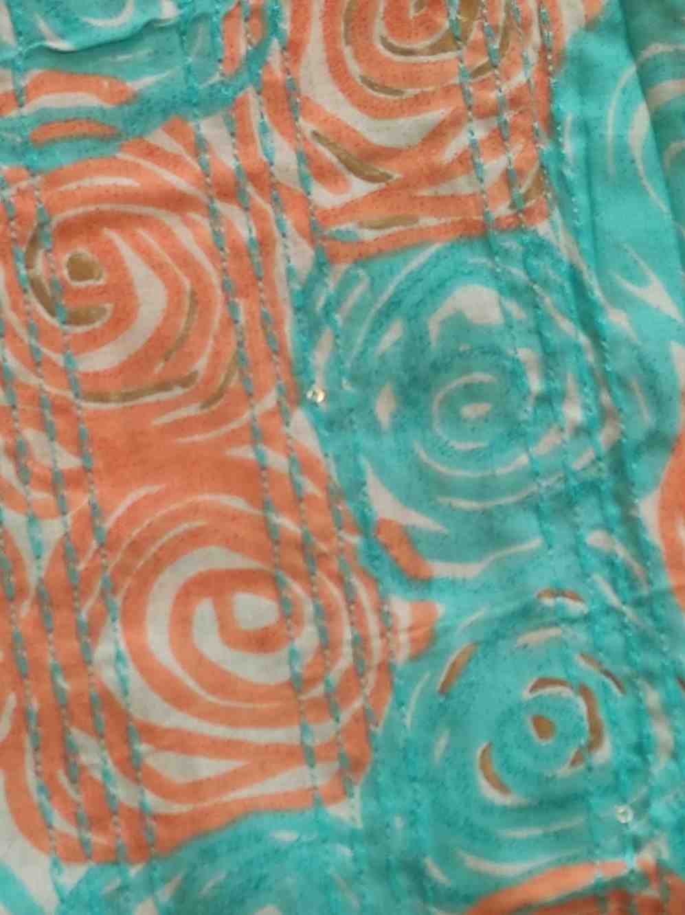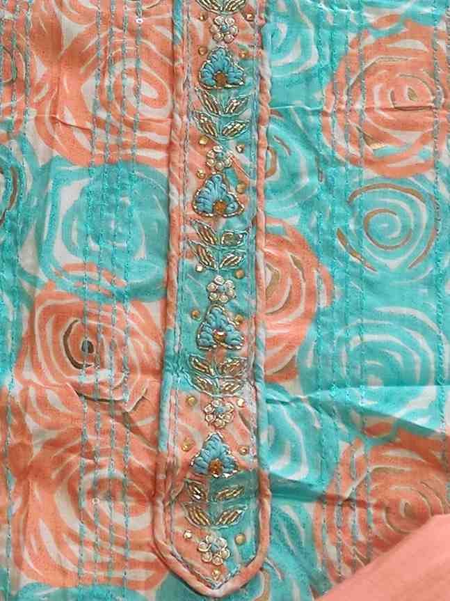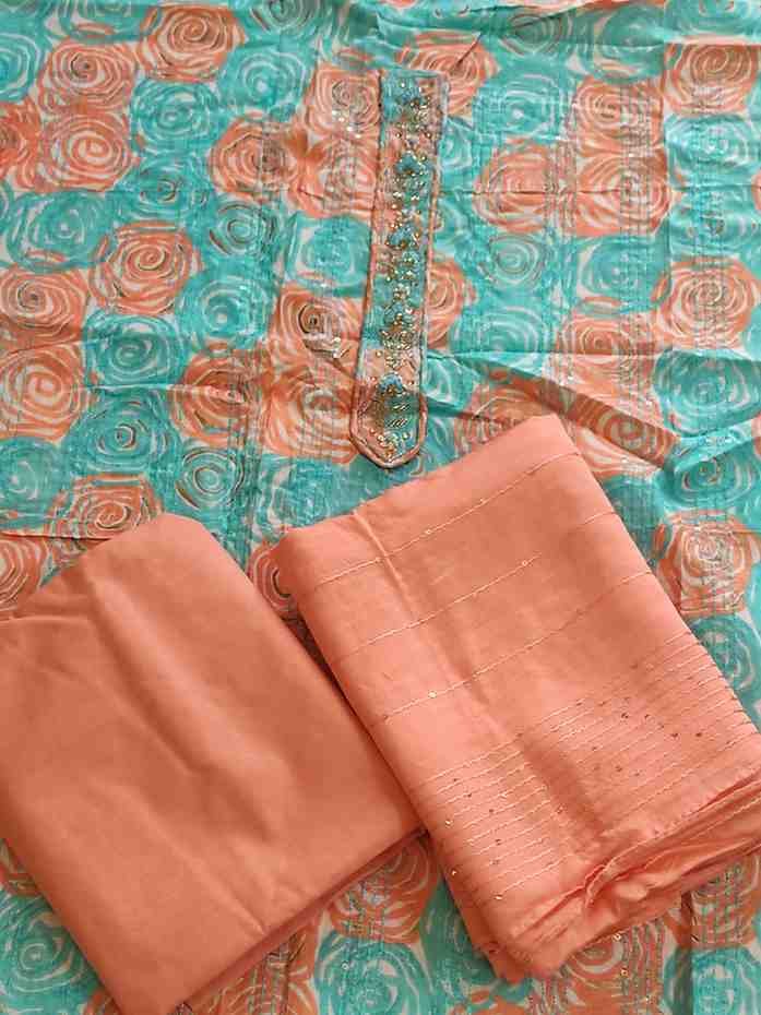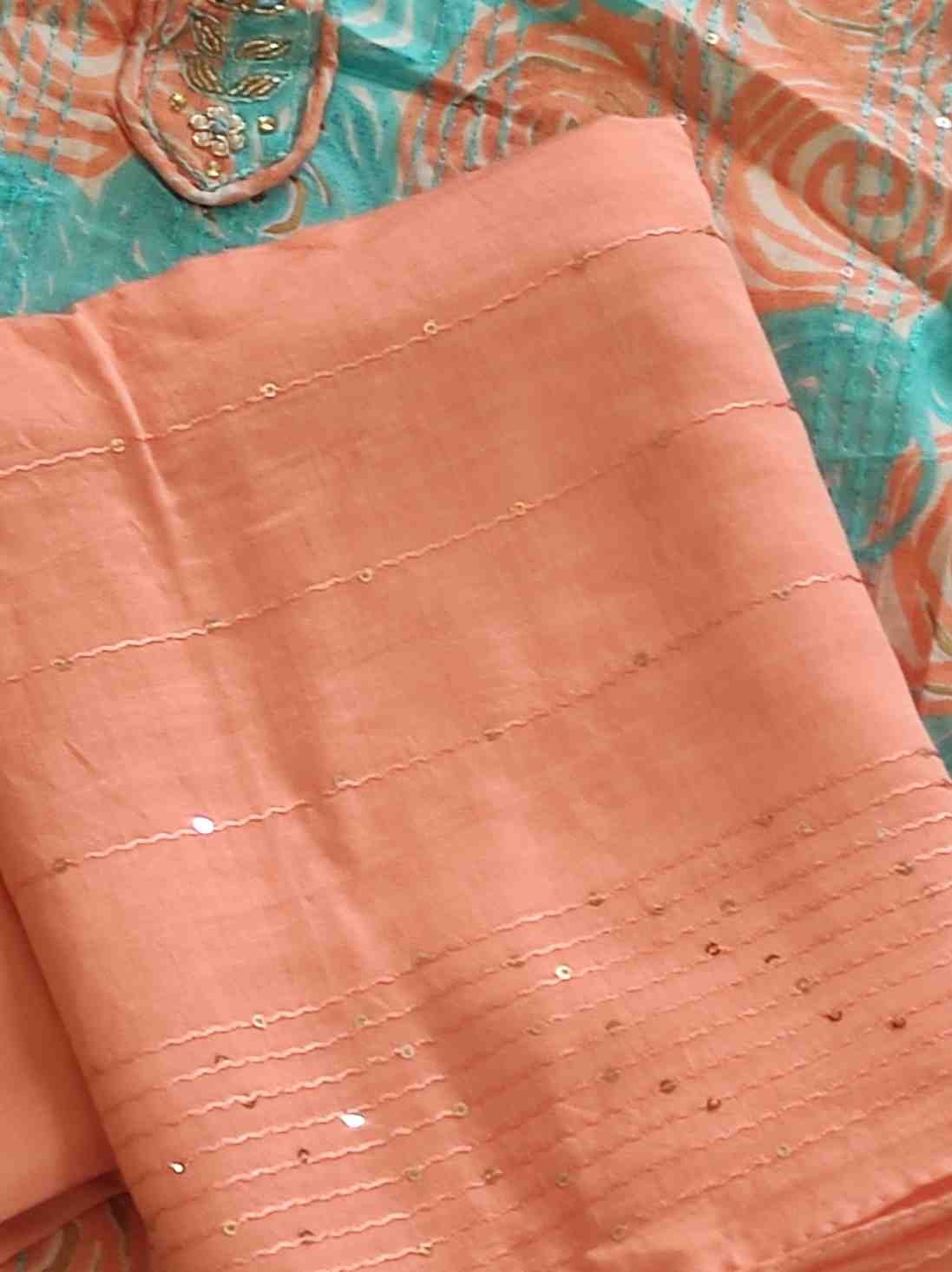 Light blue colour pure cotton suit for Festive and special occasion wear, top material is very soft pure cotton printed material embellished with sequins and hand embroidery work. Bottom is light orange colour plain rayon silk. Dupatta is light orange colour semi silk with embroidery and sequin work.Dimensions: