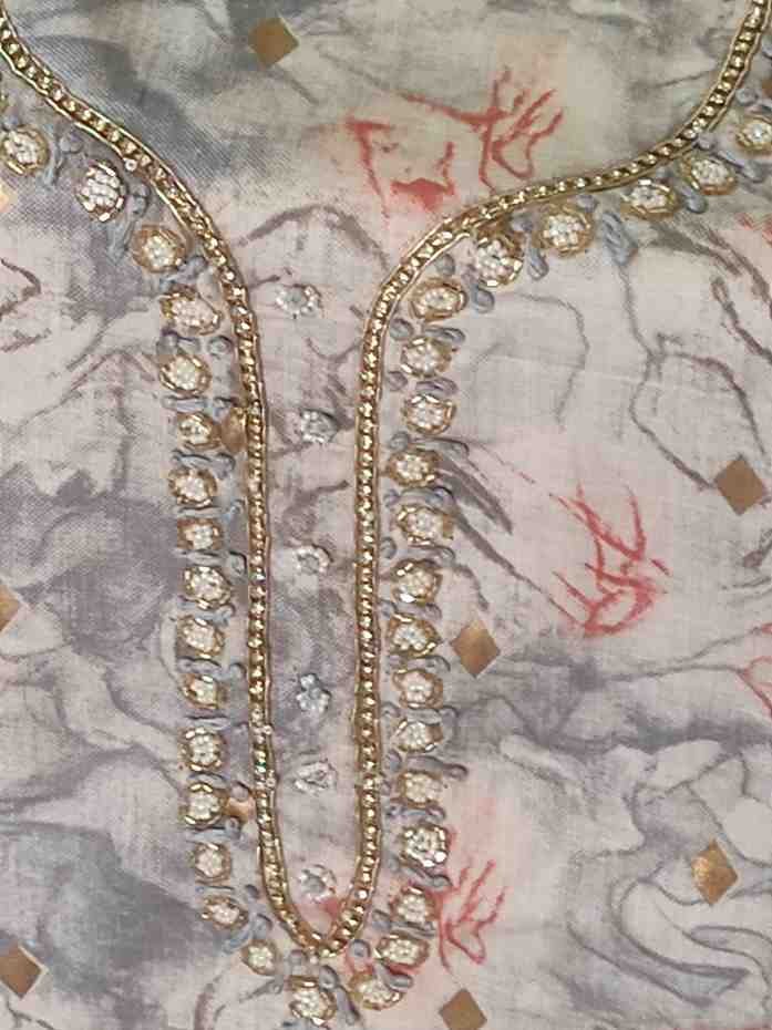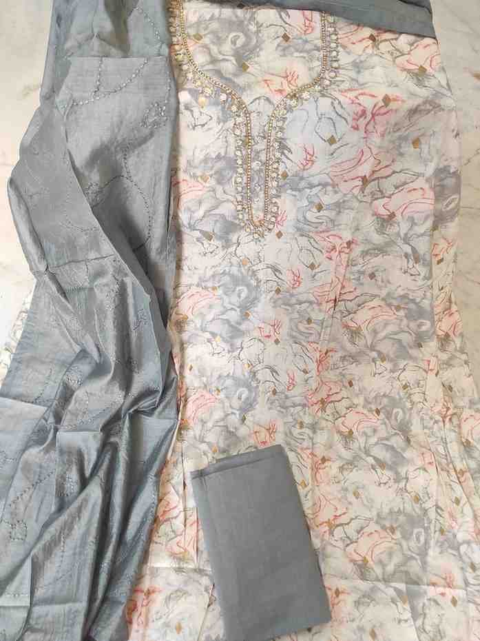 Light grey colour pure cotton printed and embrioded suit with sequin,and thread work perfect for Festive and special occasions. Top material is light grey and white colour pure cotton printed with hand embroidery and sequin work on the tie patti. Dupatta is light grey colour semi silk with thread work.