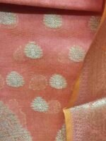Dupatta: 2.5 metres Light orange colour organza banarsi silk dupatta with all over zari woven zaal and meenakari work pattern and tassels at the ends.Dry clean only for maintainence.
