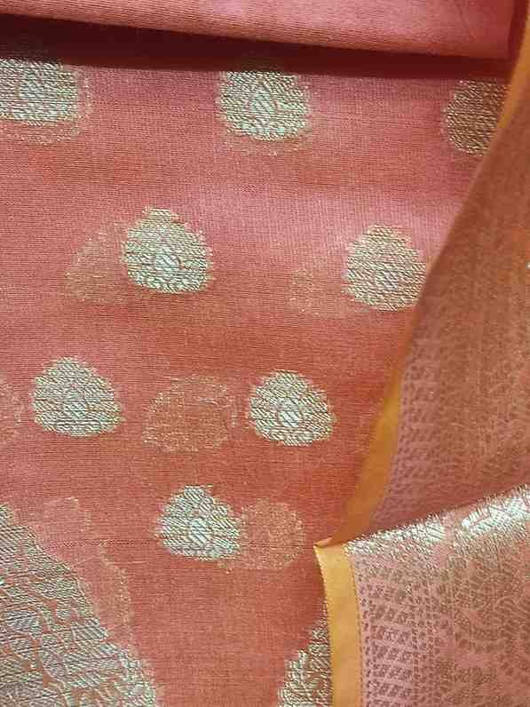 Top: 2.5 metres Light orange colour organza silk material with heavy zari woven zaal and meenakari work.