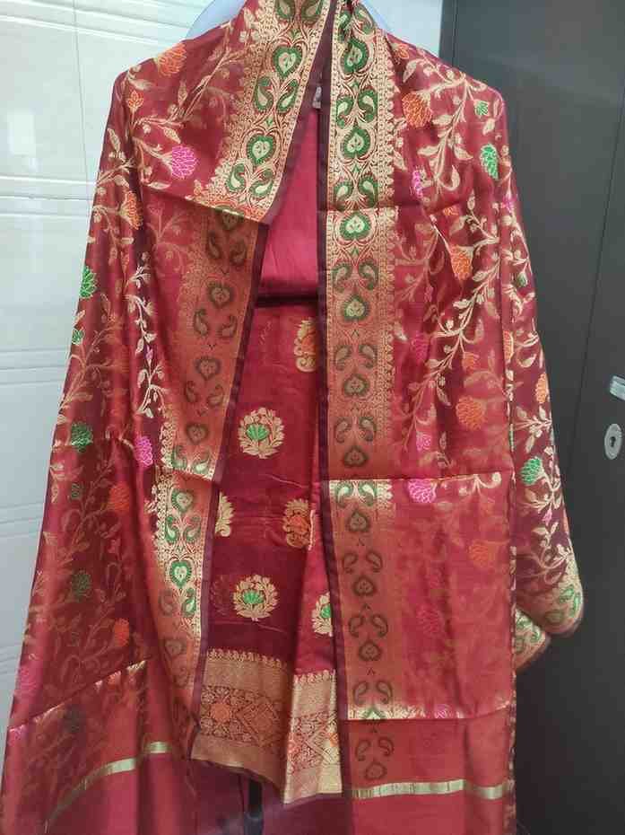 Maroon colour orgenza banarsi silk suit with heavy golden zari and meenakari work . A must have piece in your wardrobe for that festive and wedding wear looks.