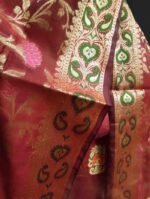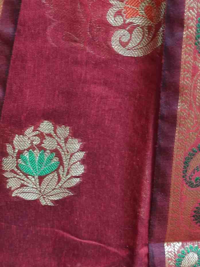 Dupatta: 2.5 metres Maroon colour banarsi silk dupatta with all over zari woven zaal and meenakari work pattern and tassels at the ends.Dry clean only for maintainence.