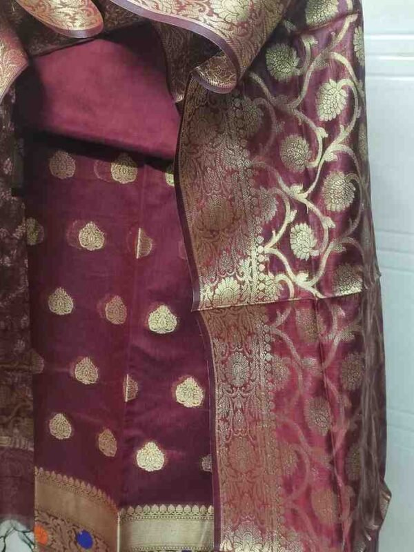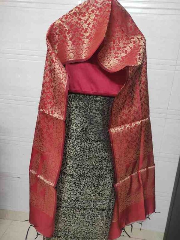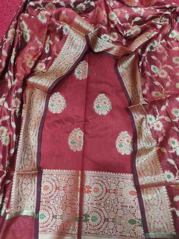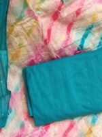 Multi colour soft pure rayon cotton suit, embrioded with sequin,and thread work perfect for Festive and special occasions. Top material is multi colour pure rayon cotton with hand embroidery, sequin work on the tie patti. Dupatta is blue colour semi silk with sequin embroidery work.