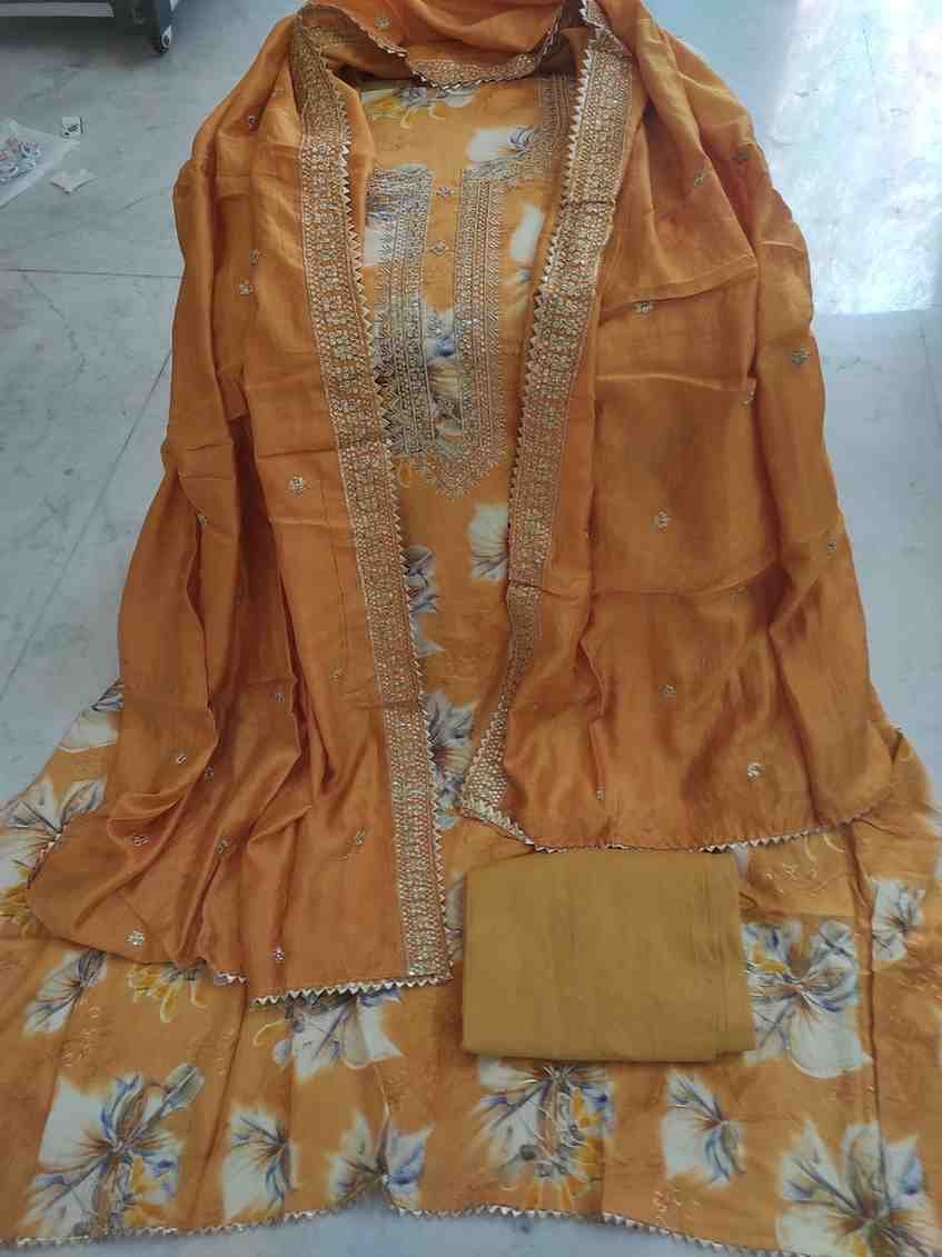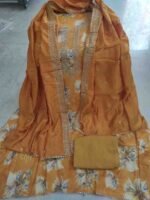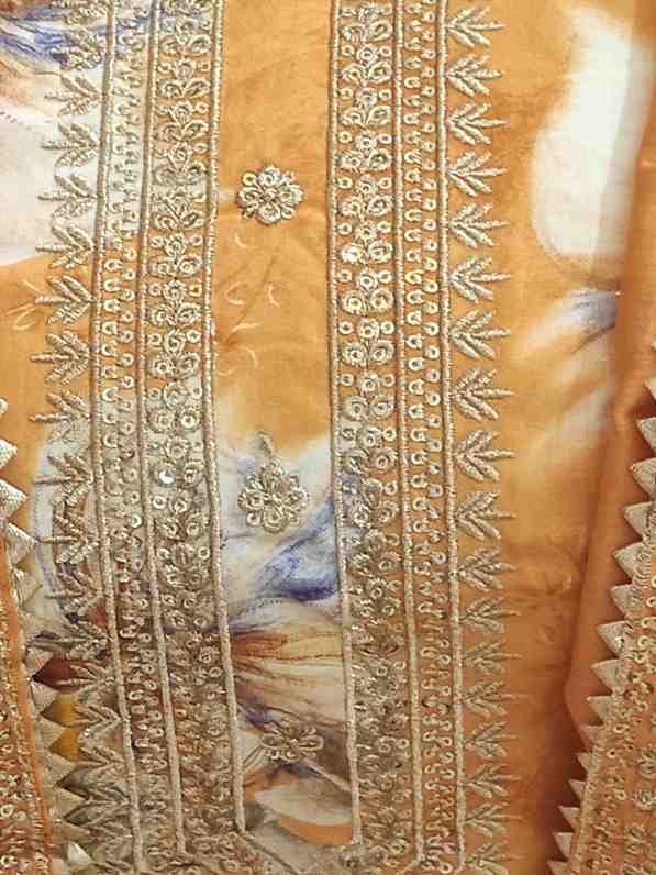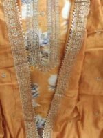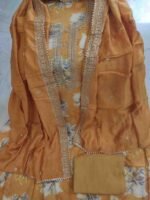 Mustard yellow colour soft pure rayon cotton suit,embrioded with sequin and zari work perfect for Festive and special occasions. Top material is mustard yellow colour printed pure rayon cotton embrioded with golden zari,lace and sequin work. Dupatta is mustard yellow colour soft silk with embroidery,sequin and gotta patti work along the edges.