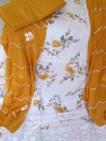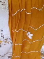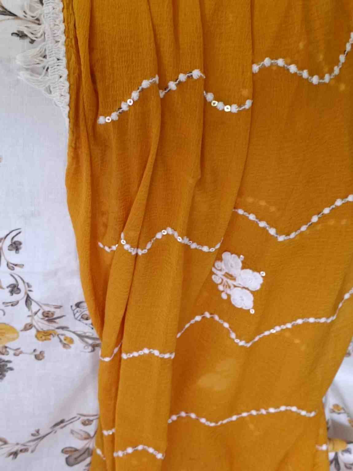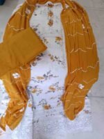 Pure cambric cotton mustard yellow colour embrioded suit with mirror, lace and thread work on tie patti, perfect for festive and special occasions. Top material is mustard yellow colour cotton embellished with embroidery,thread work and lace work on the tie patti and bottom. Dupatta is mustard yellow colour plain crape chiffon with thread and lace work.