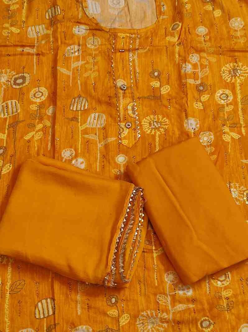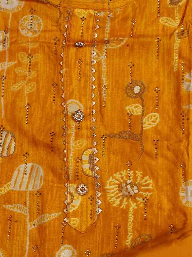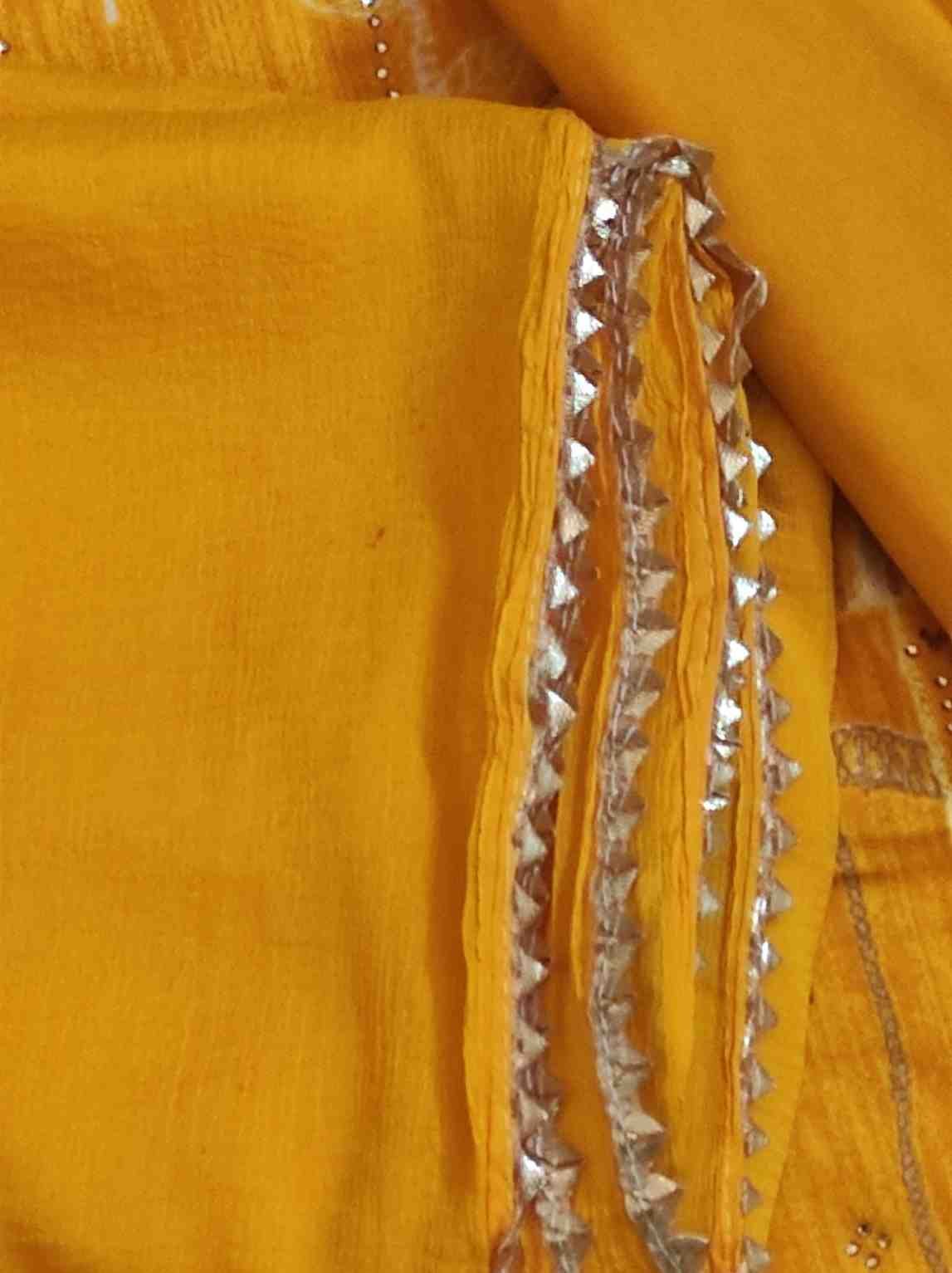 Mustard yellow colour pure rayon cotton printed suit with gotta patti work for Festive and special occasions. Top material is mustard yellow colour, printed soft pure rayon cotton embellished with gotta patti work on tie patti and bottom . Bottom is plain pure rayon mustard yellow colour soft material. Dupatta is mustard yellow colour georgette material with gotta patti work on all its edges.Dimensions: