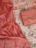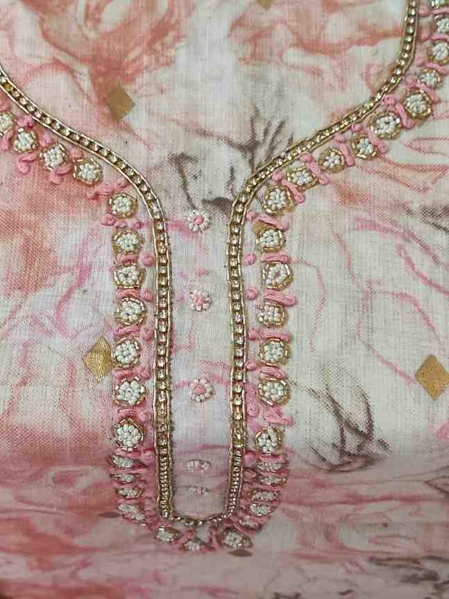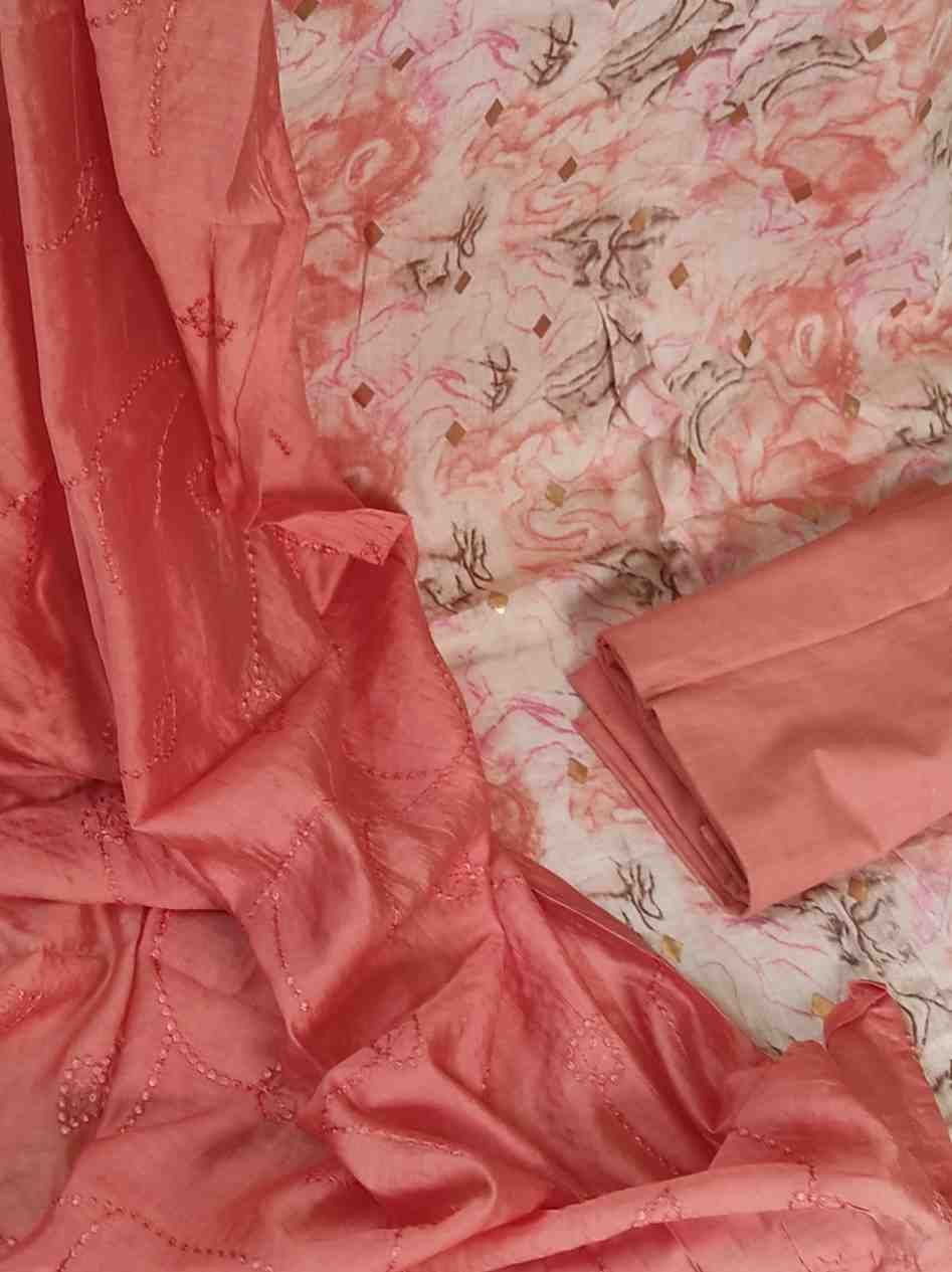 Onion pink colour pure cotton printed and embrioded suit with sequin,and thread work perfect for Festive and special occasions. Top material is onion pink and white colour pure cotton printed with hand embroidery and sequin work on the tie patti. Dupatta is onion pink colour semi silk with thread work.