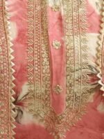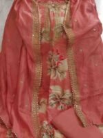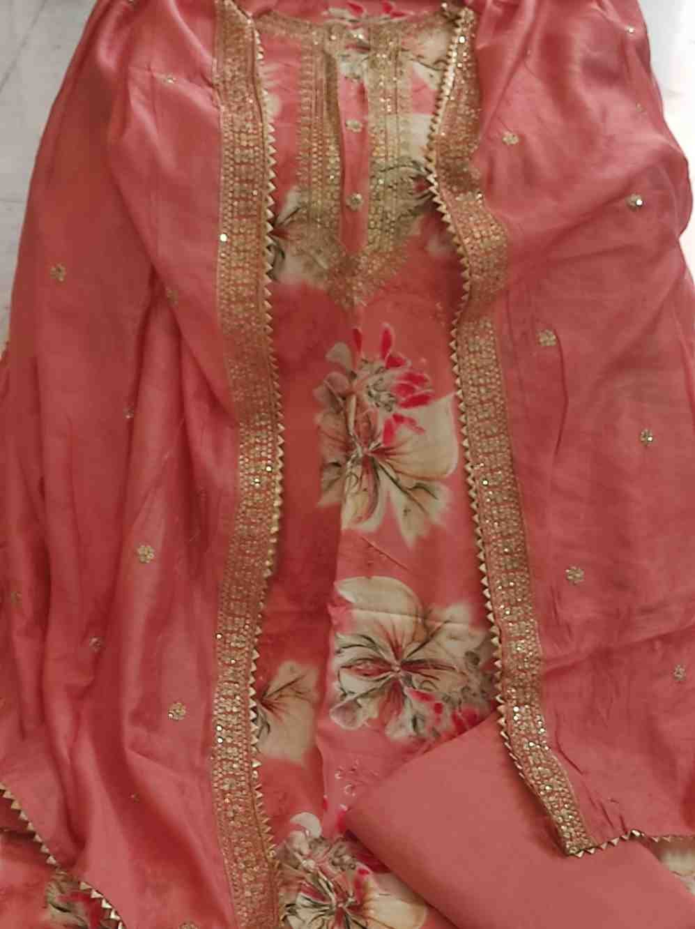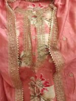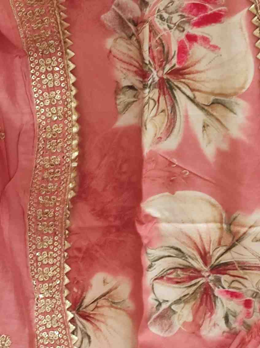 Onion pink colour soft pure rayon cotton suit,embrioded with sequin and zari work perfect for Festive and special occasions. Top material is onion pink colour printed pure rayon cotton embrioded with golden zari,lace and sequin work. Dupatta is onion pink colour soft silk with embroidery,sequin and gotta patti work along the edges.