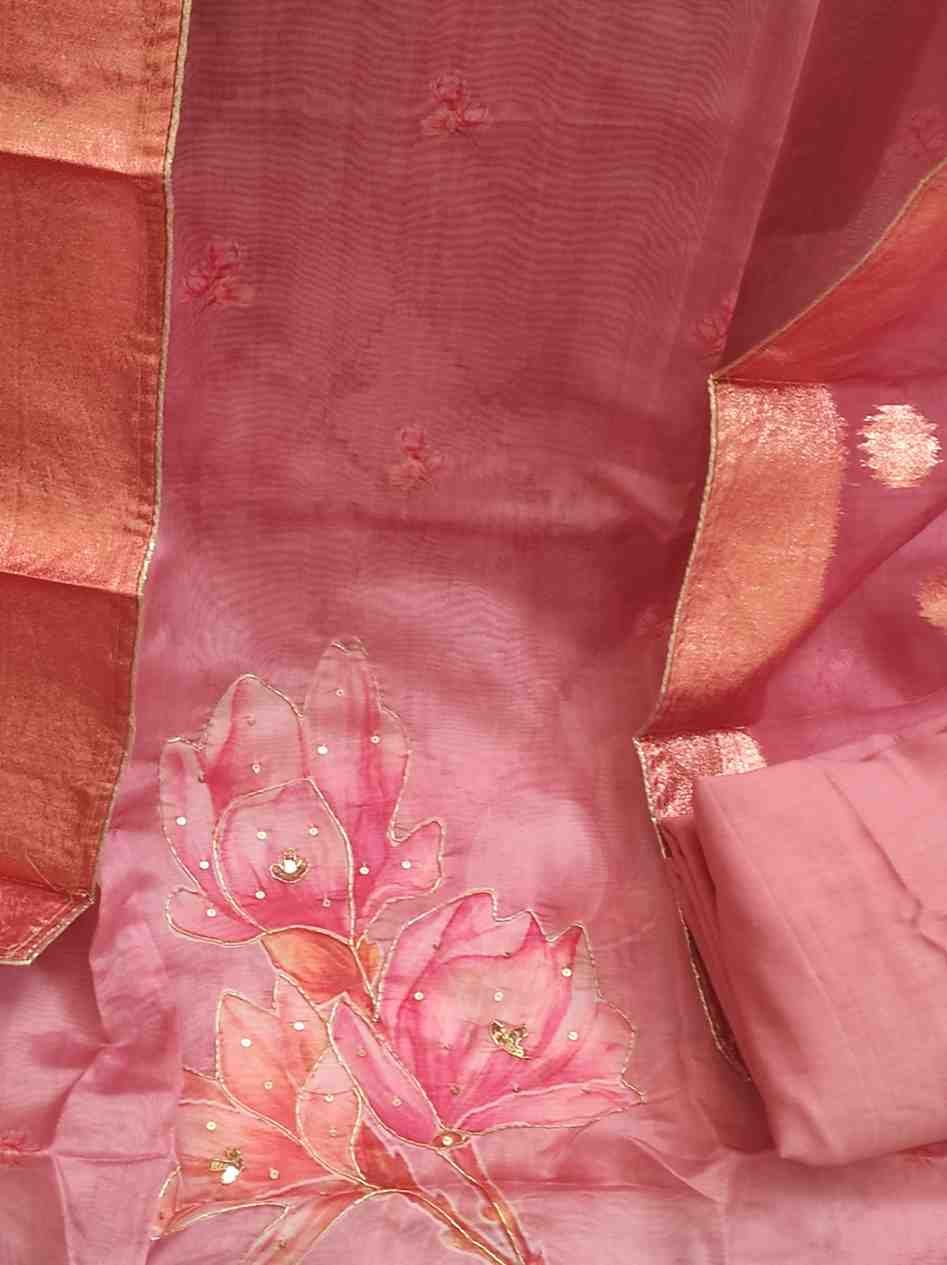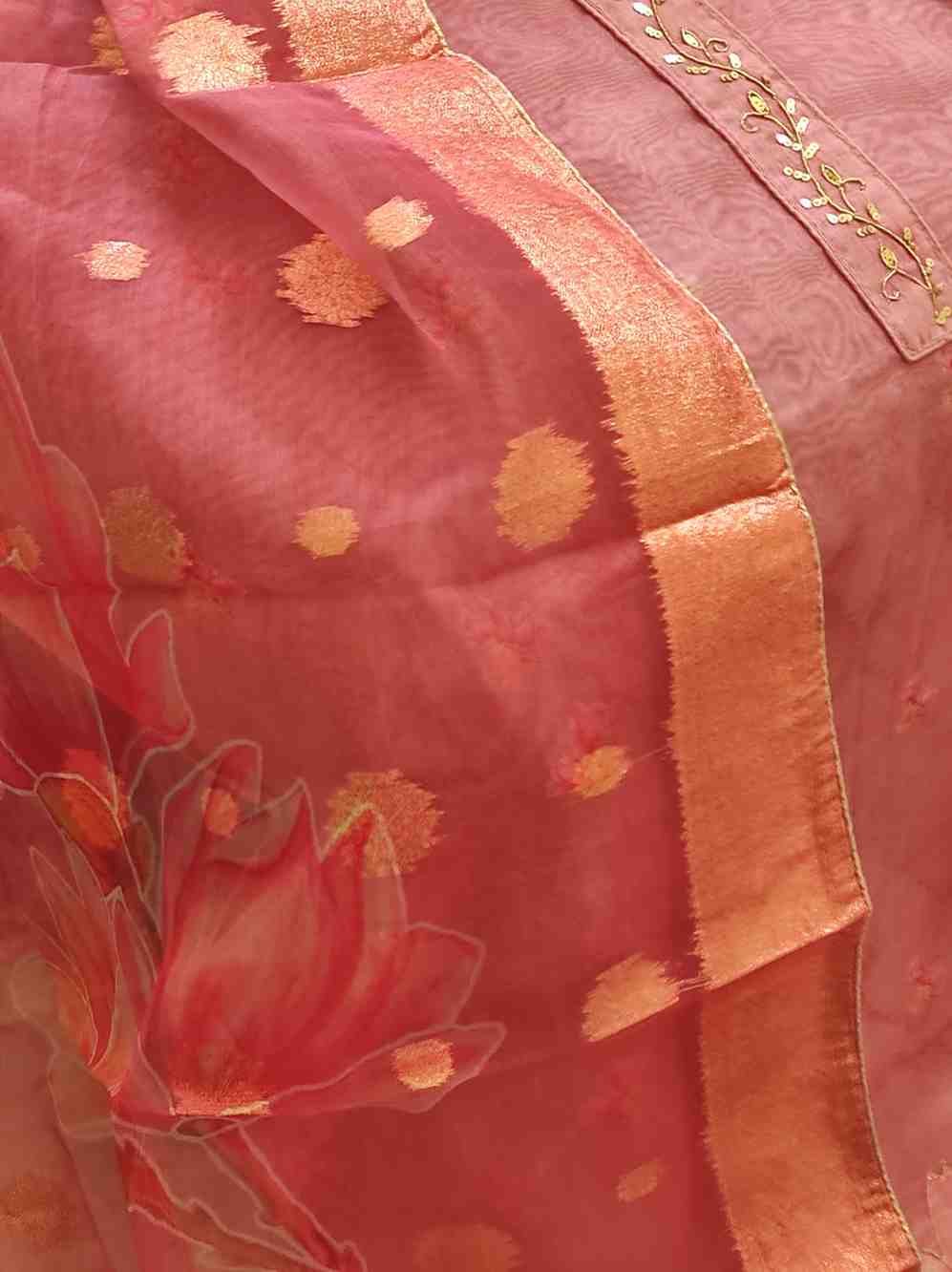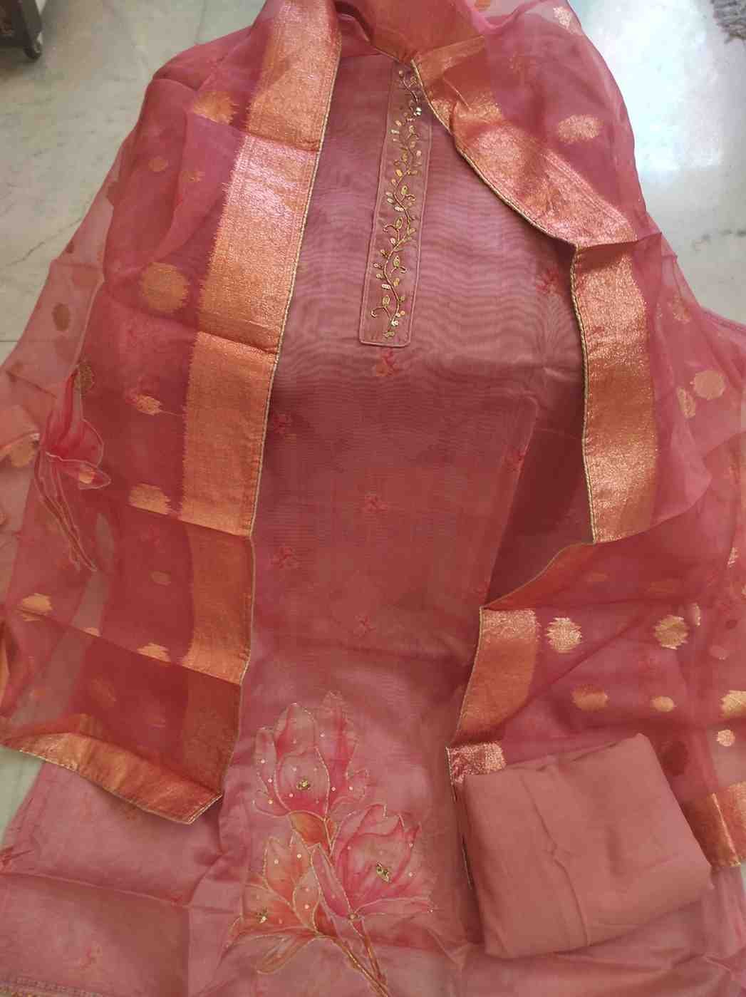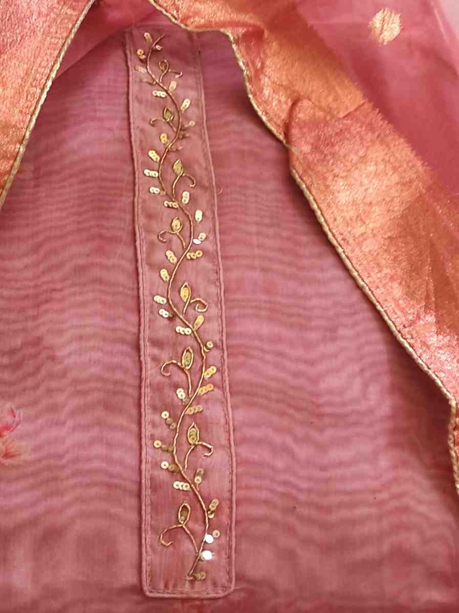 Onion pink colour pure organza printed and embrioded suit with sequin,and thread work perfect for Festive and special occasions. Top material is onion pink colour pure soft organza, printed and hand embroided with sequin work on the tie patti. Dupatta is onion pink colour organza printed with foil work.
