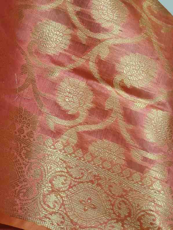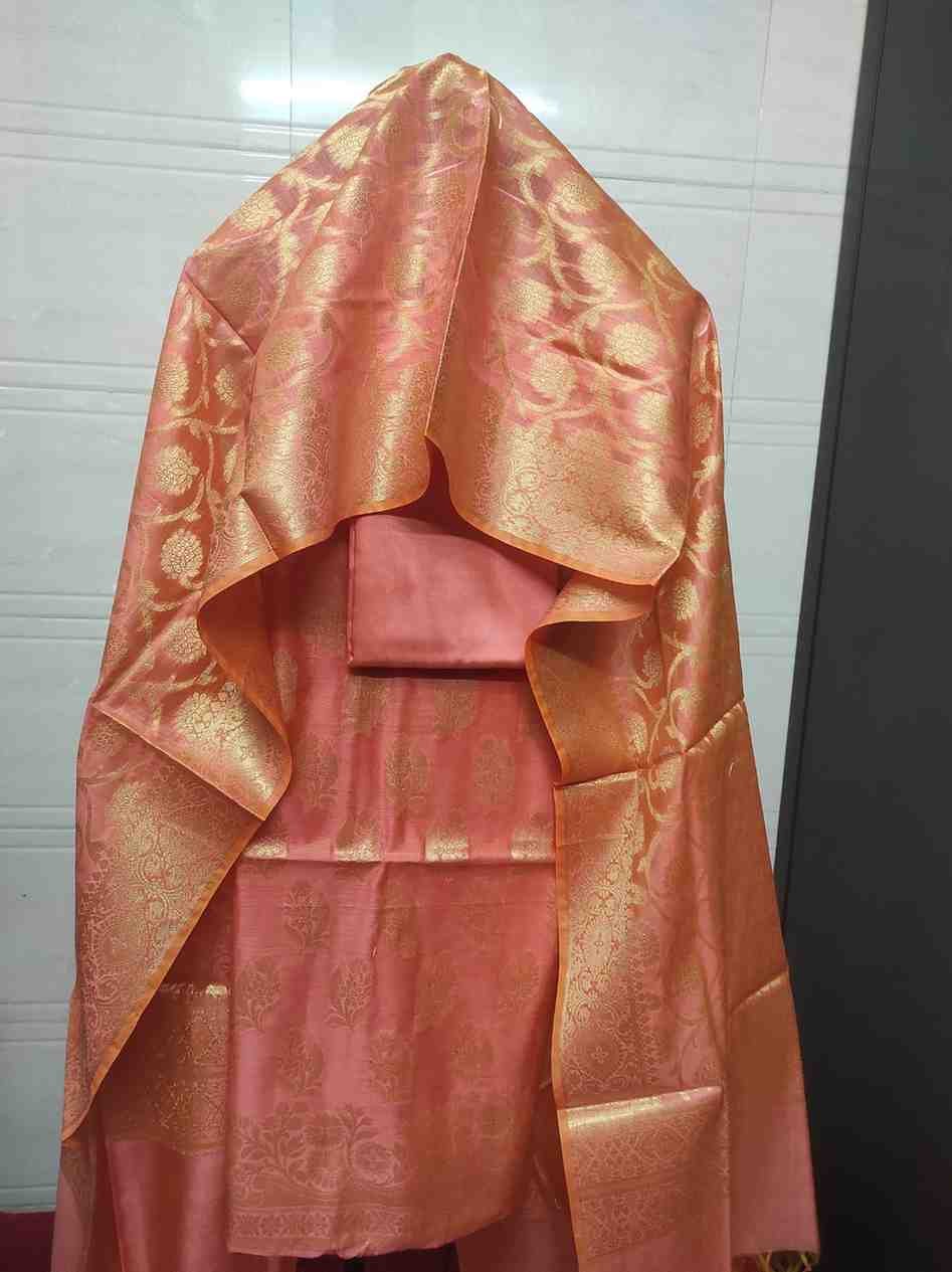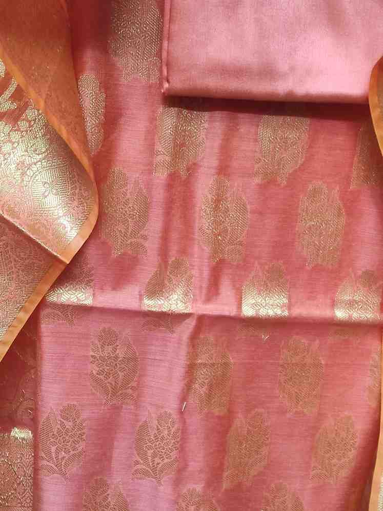 Pink colour orgenza banarsi silk suit with heavy golden zari and meenakari work . A must have piece in your wardrobe for that festive and wedding wear looks.