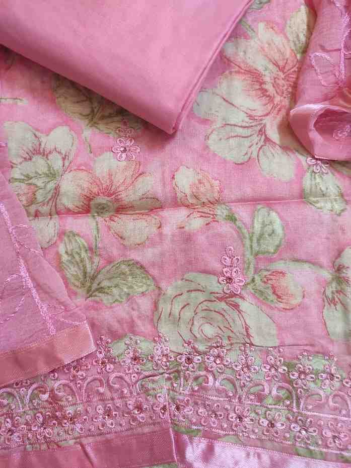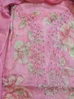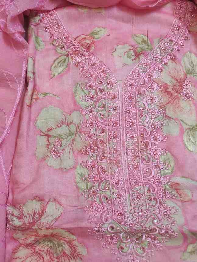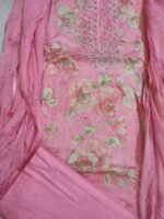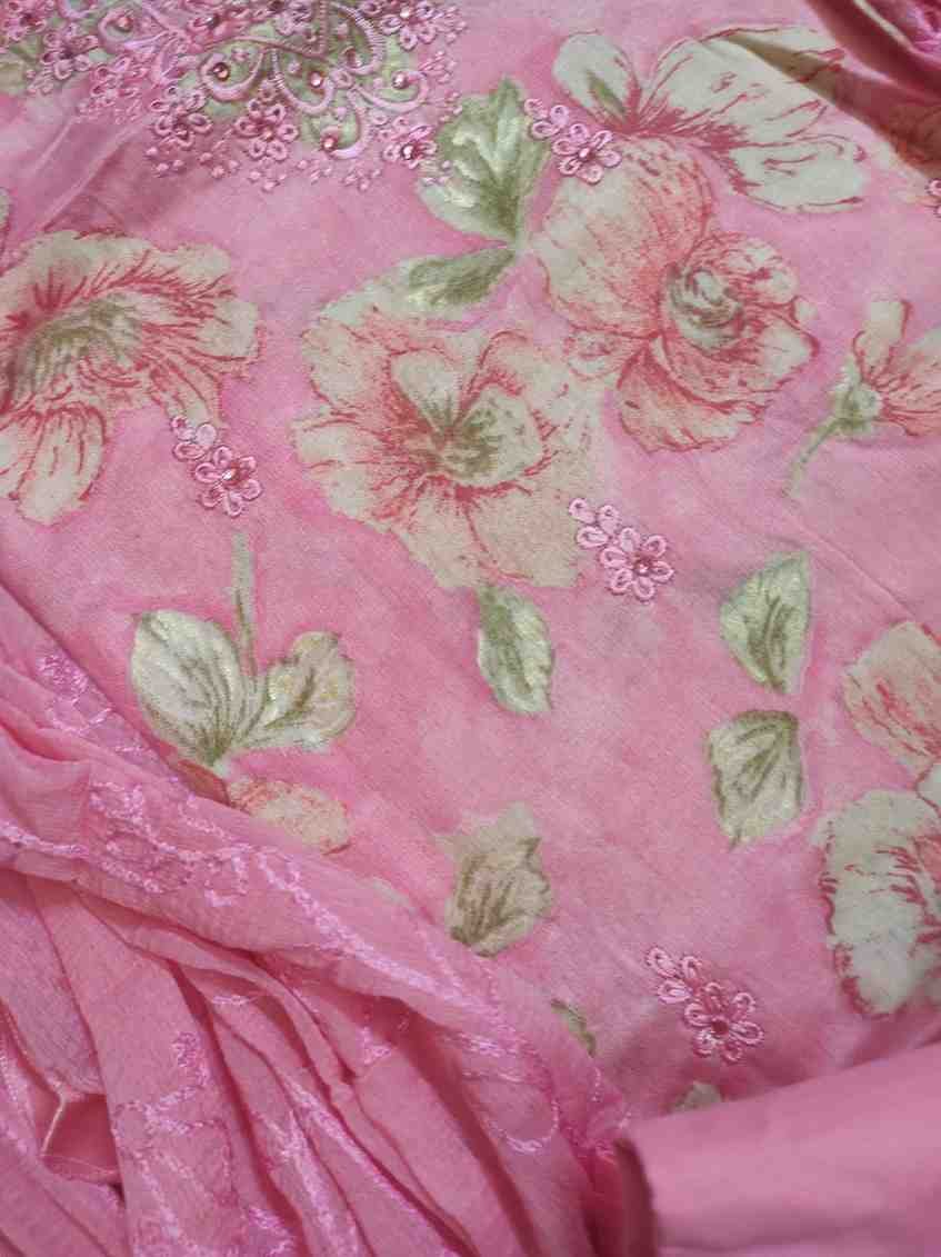 Pink colour pure cotton suit for Festive and special occasion wear, top material is very soft pure cotton pink colour printed material embellished with sequins and hand embroidery work. Bottom is pink colour plain rayon silk. Dupatta is pink colour chiffon with full zaal thread embroidery work.Dimensions: