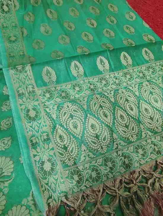 Dupatta: 2.5 metres with all over woven zaal work pattern and tassels at the ends.Dry clean only for maintainence.