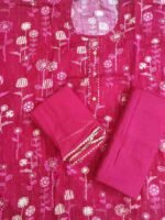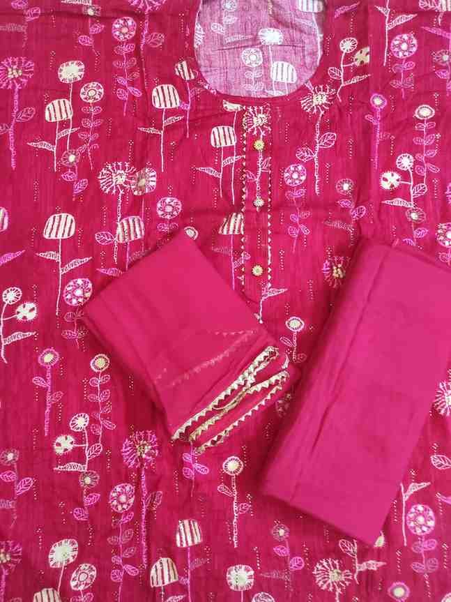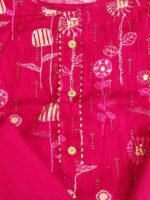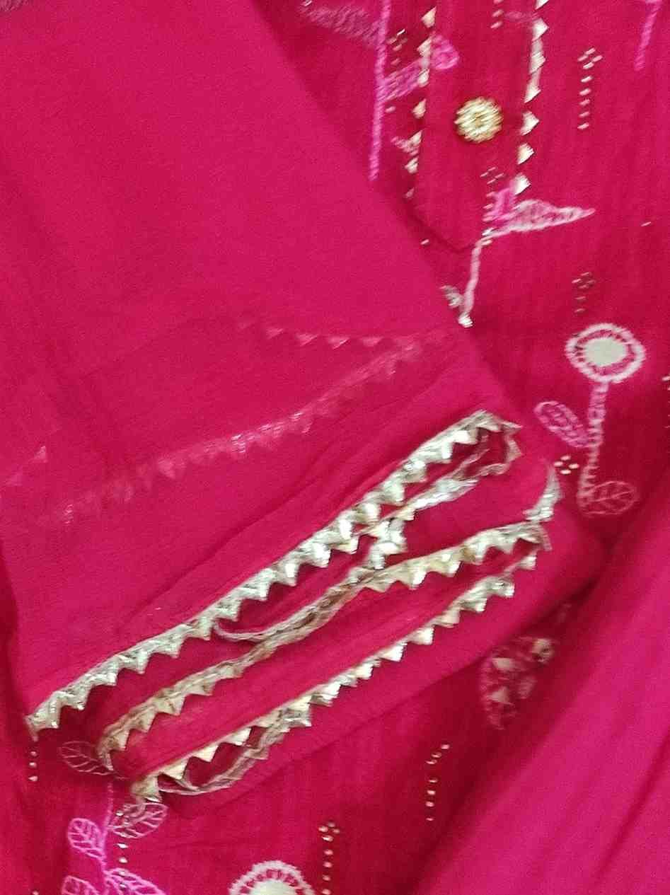 Rani pink colour pure rayon cotton printed suit with gotta patti work for Festive and special occasions. Top material is rani pink colour, printed soft pure rayon cotton embellished with gotta patti work on tie patti and bottom . Bottom is plain pure rayon rani pink colour soft material. Dupatta is rani pink colour georgette material with gotta patti work on all its edges.