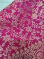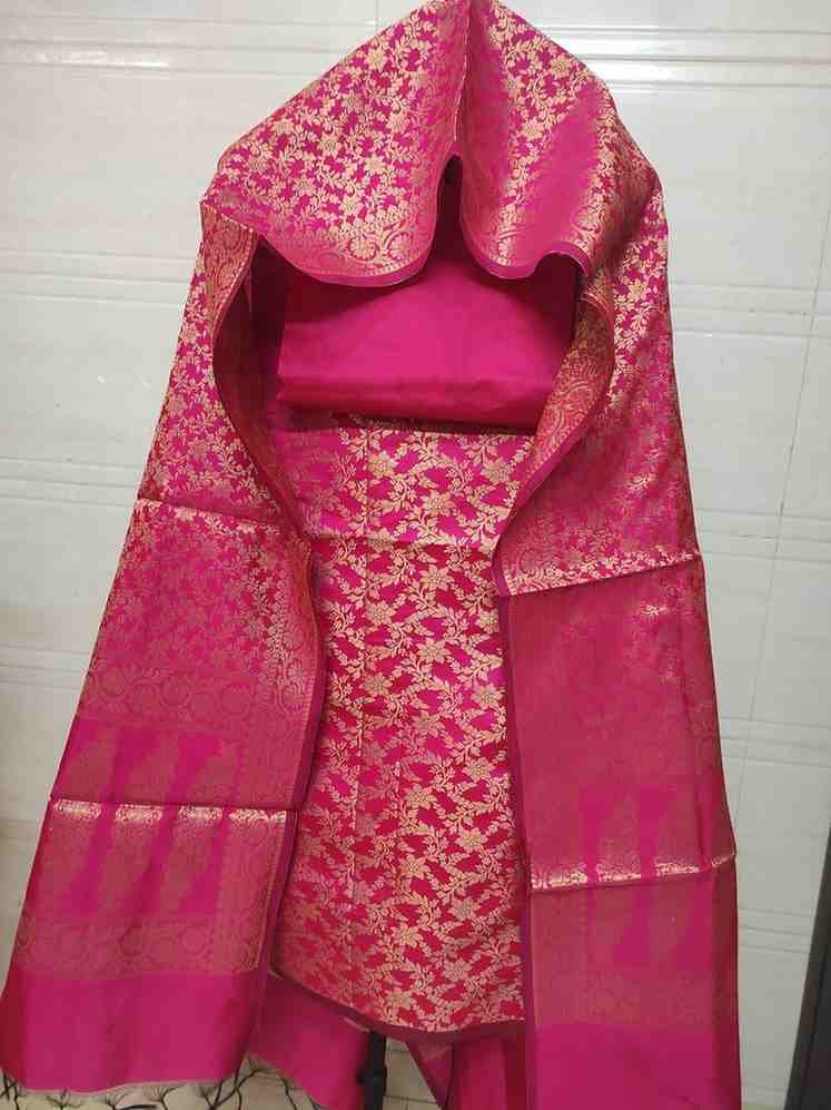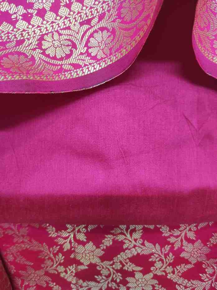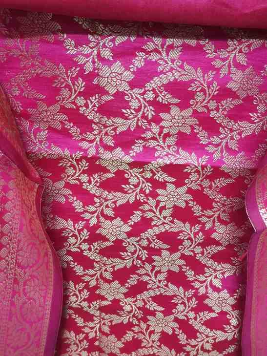 Rani pink colour satin silk banarsi suit with heavy golden zari work . A must have piece in your wardrobe for that festive and wedding wear.