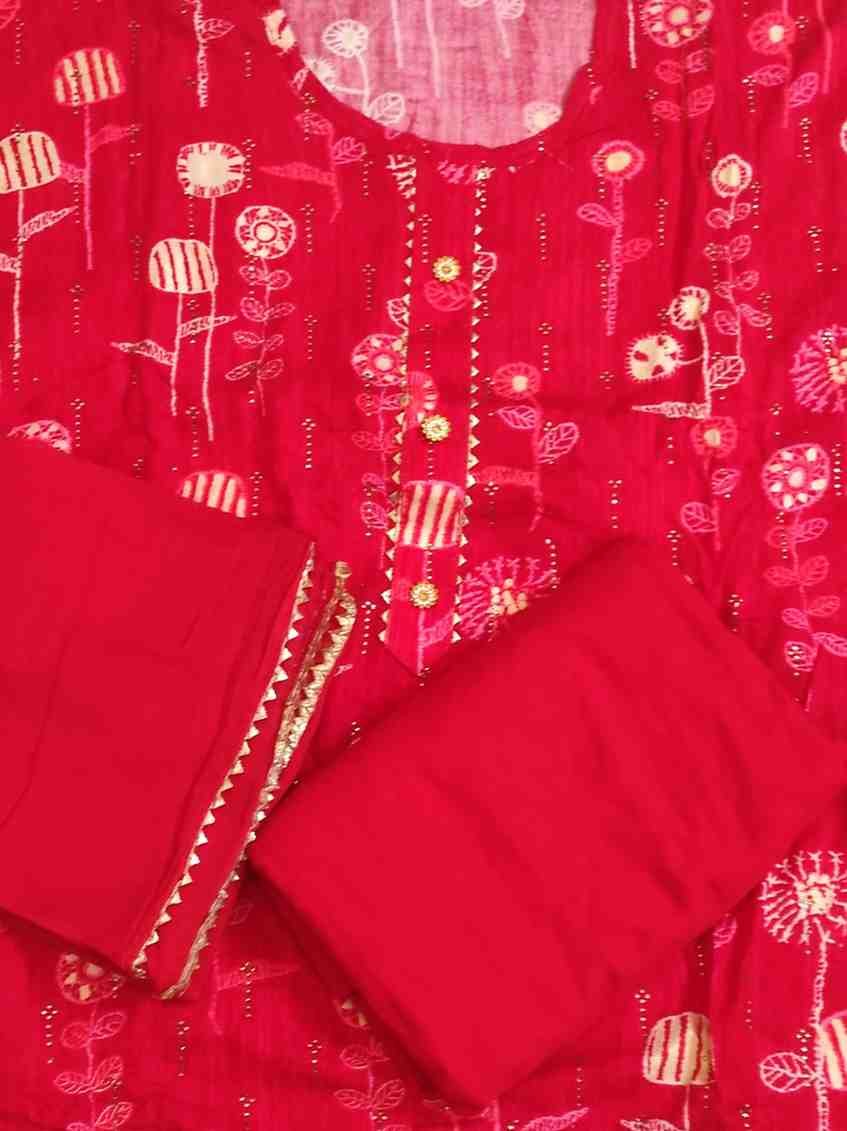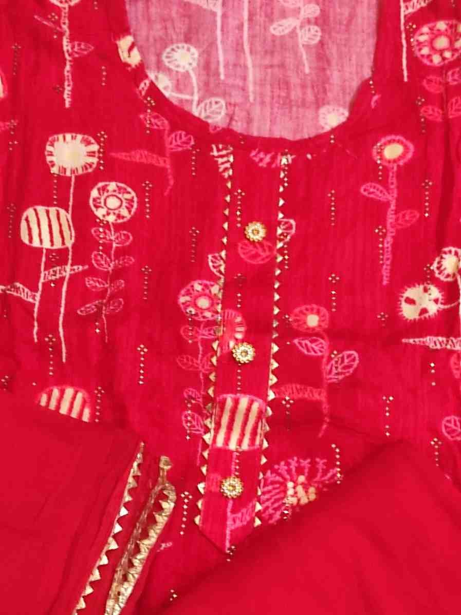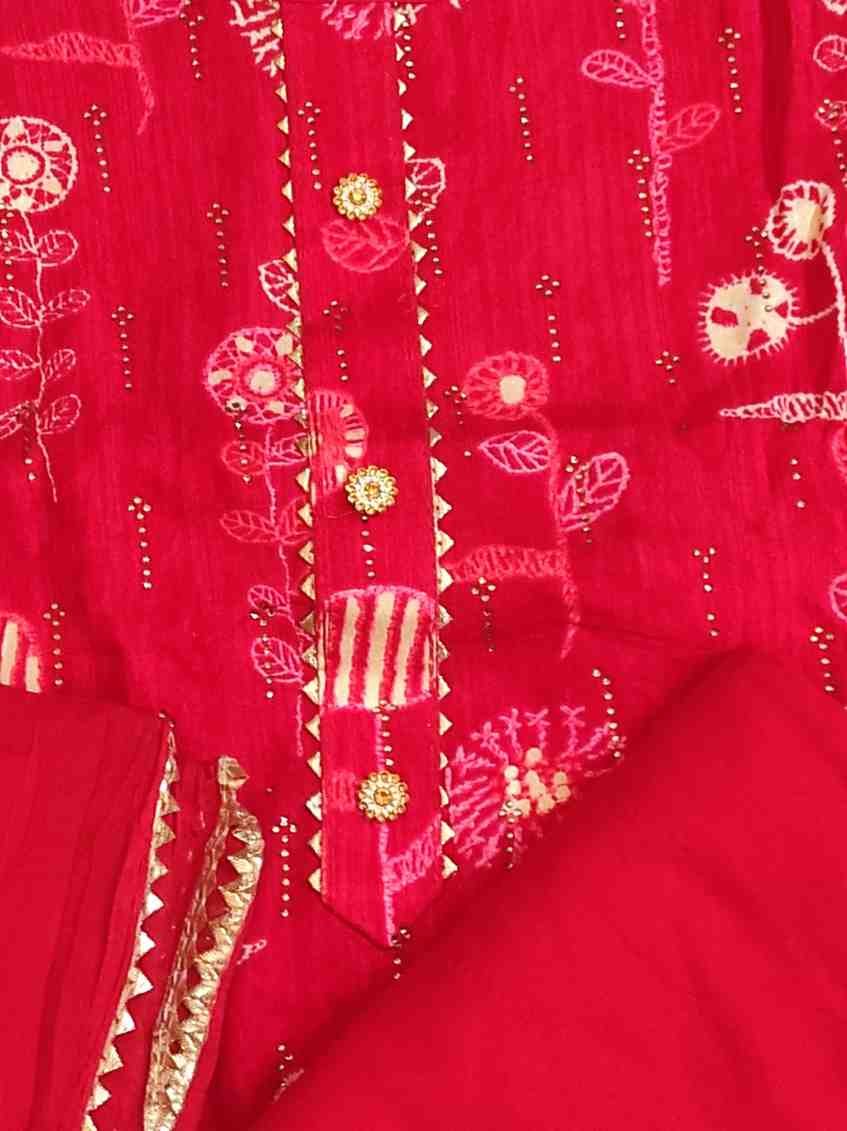 Light red colour pure rayon cotton printed suit with gotta patti work for Festive and special occasions. Top material is red colour, printed soft pure rayon cotton embellished with gotta patti work on tie patti and bottom . Bottom is plain pure rayon red colour soft material. Dupatta is red colour georgette material with gotta patti work on all its edges.