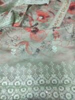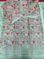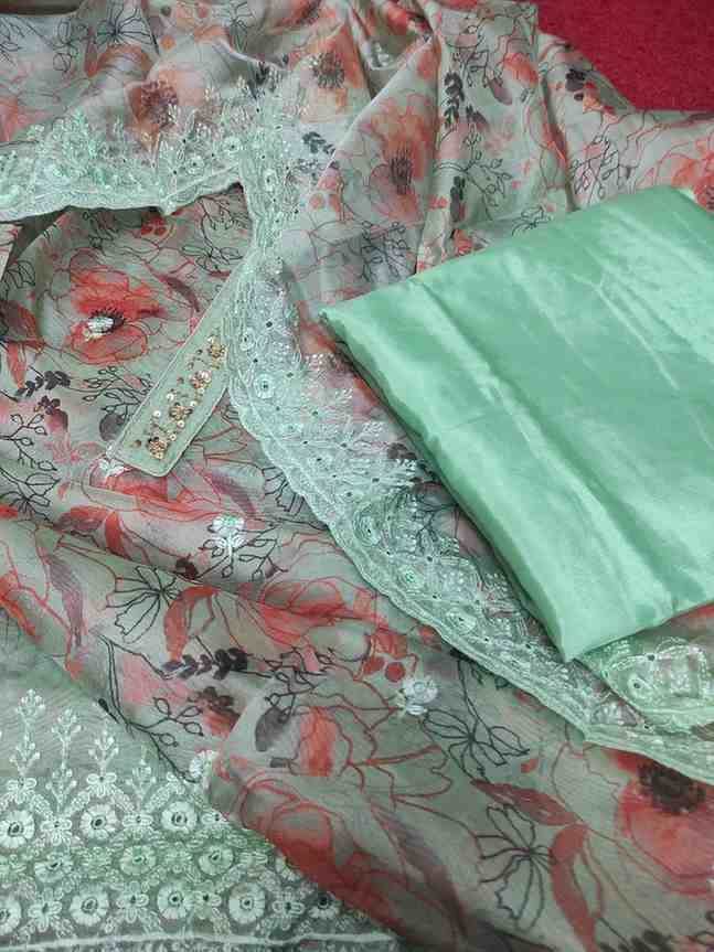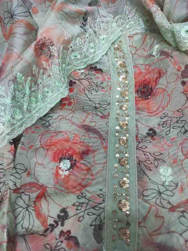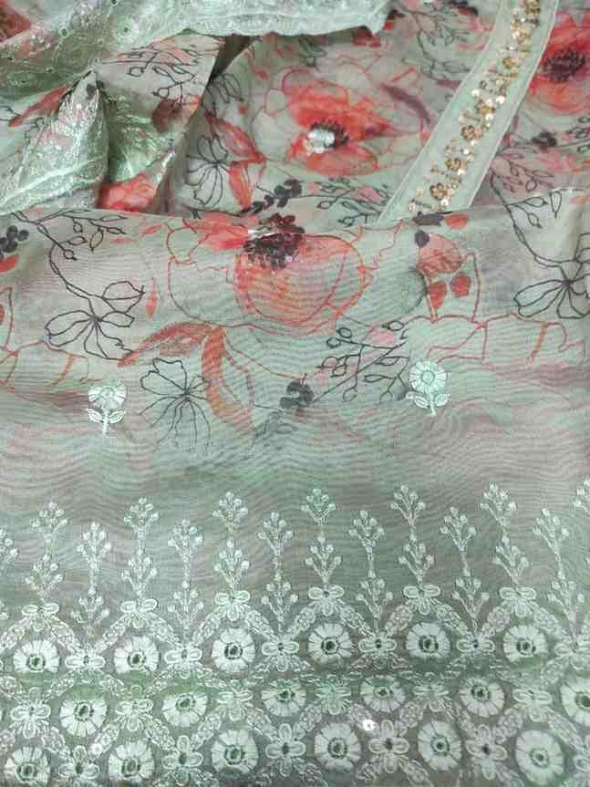 Sea green colour organza silk printed suit with embroidery and sequin work for Festive and special occasions. Top material is sea green colour,printed very soft organza silk embellished with sequins and hand embroidery work on tie patti and scalloped border at the bottom. Bottom is plain sea green colour soft silk material. Dupatta is sea green colour organza silk with thread and sequin embroidery work with scalloped border.