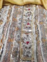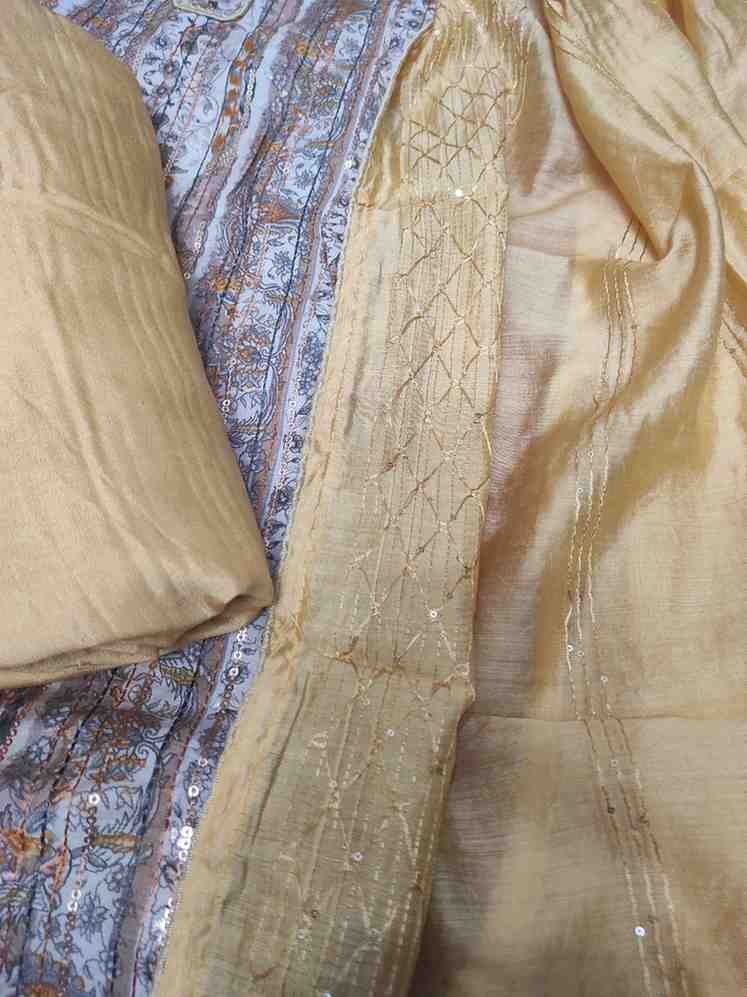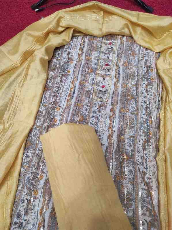 Yellow and beige colour pure cotton Jaipuri print suit for Festive and special occasion wear, top material is very soft beige colour semi silk printed material embellished with sequins and hand embroidery work. Bottom is yellow colour plain rayon silk. Dupatta is yellow colour semi silk with thread and sequin embroidery work.