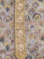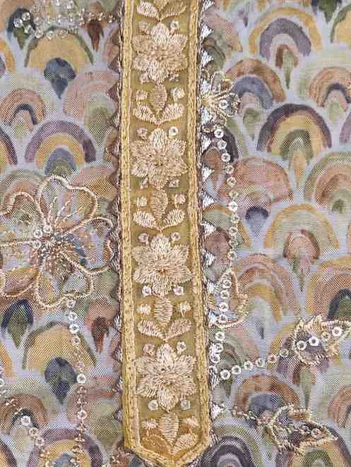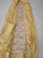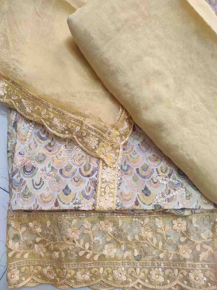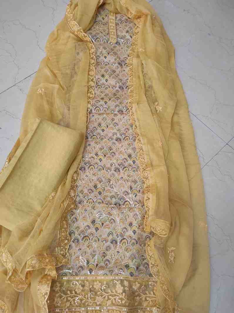 Festive and special occasion wear, top material is embellished with sequins and Gota Patti work, embroidery and scalloped lace border. Bottom is plain rayon silk. Dupatta is pure chiffon with embroidery and sequin work, adorned with scalloped lace work on all the four sides.